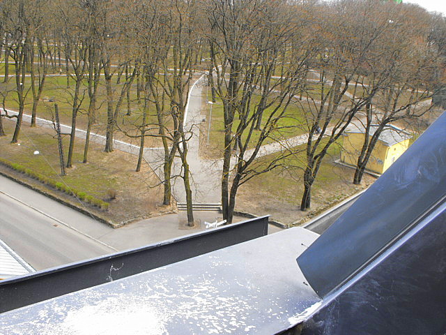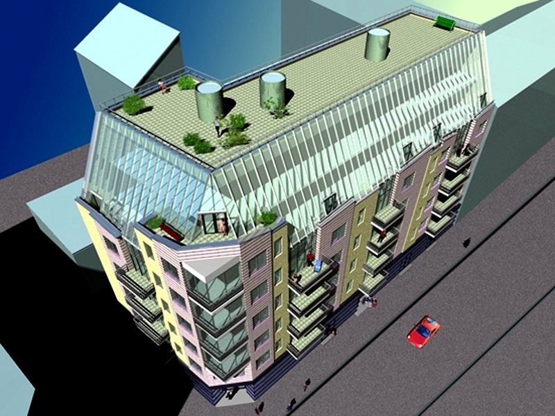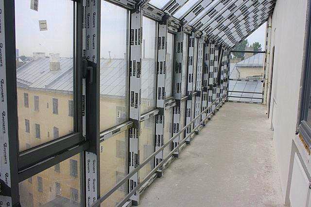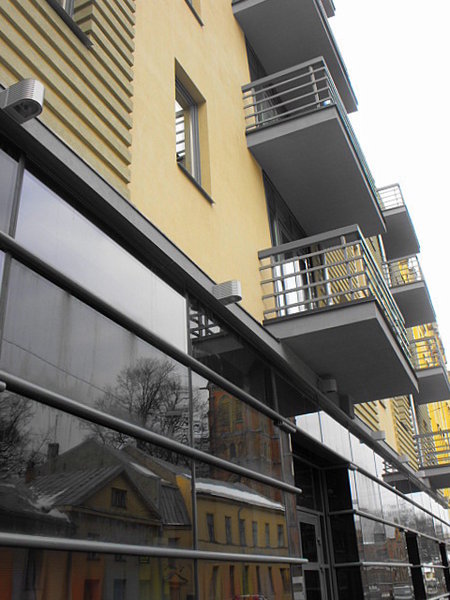 Pēdējie stāvi atvirzīti slīpumā no ēkas fasādēm, stiklu vitrīnu izpildījumā.