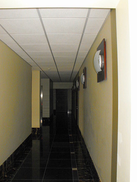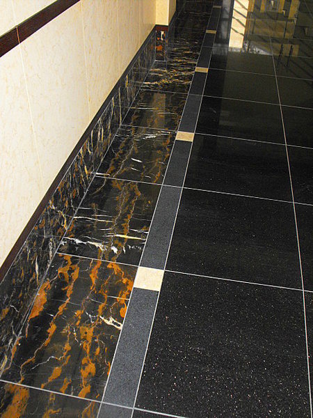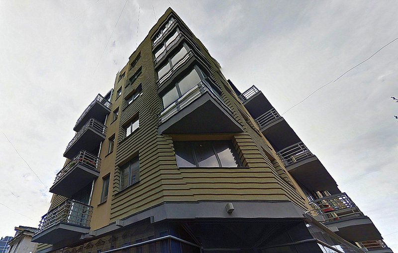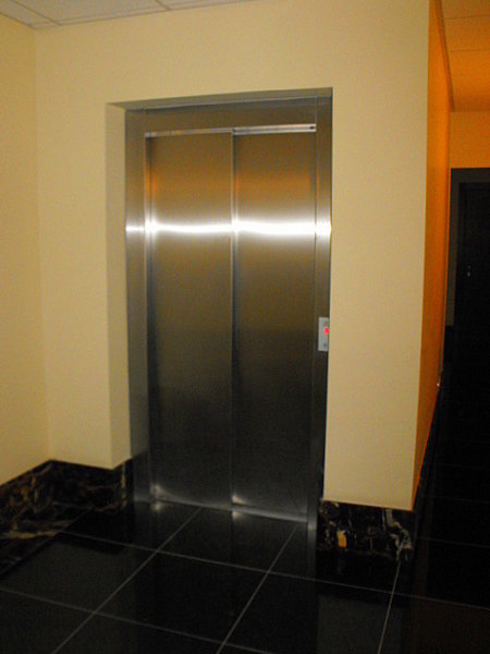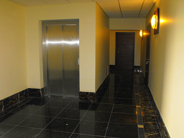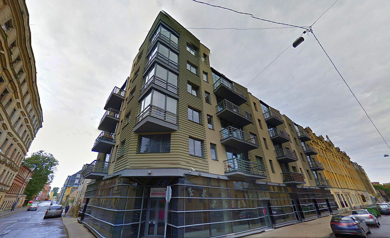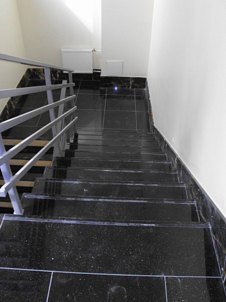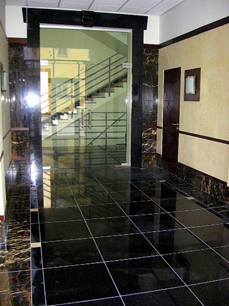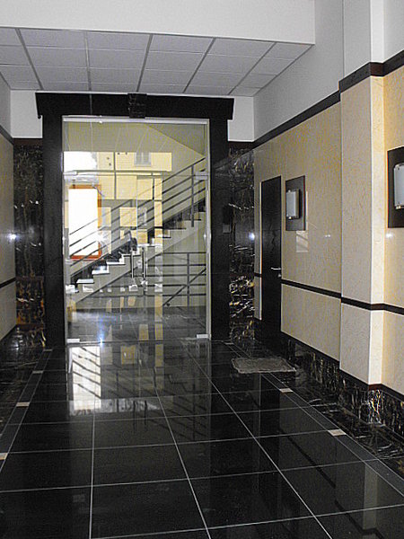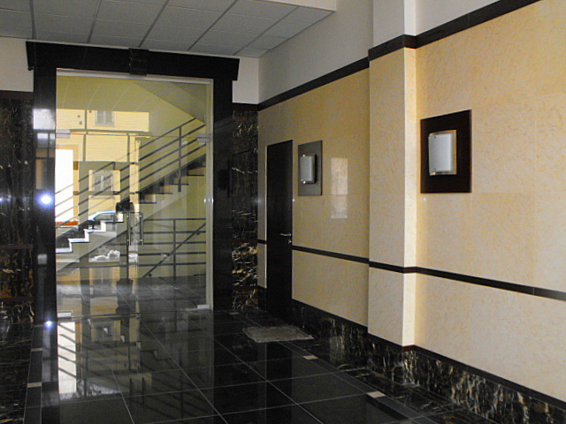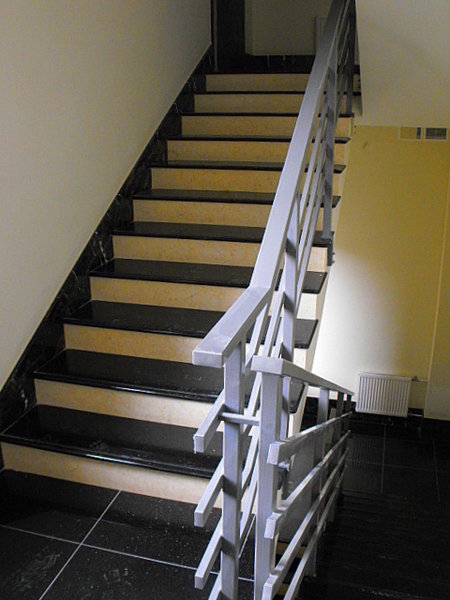 Ēkas fasādes un koplietošanas telpu apdarei izmantots granīts.